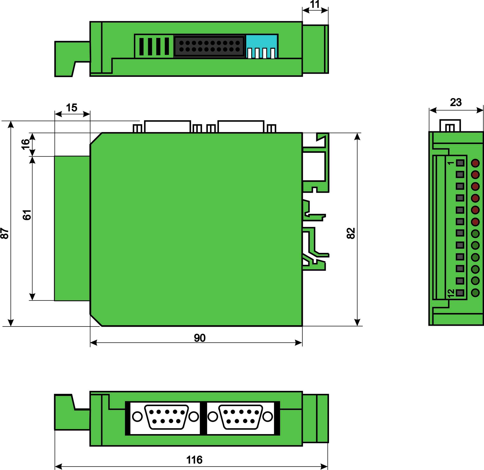ЛИР-980 изготавливается в малогабаритном пластмассовом корпусе с креплением, предназначенным для установки модуля на DIN-рельс. Для подключения внешних проводов используются разъемные колодки с винтовыми зажимами. Преобразователи перемещений подключаются к двум разъемам D-SUB DB9F (розетка).