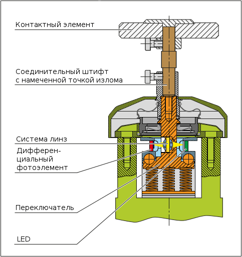 Контактный элемент легко заменяется. Соединительный штифт, соединяющий контактный элемент с датчиком, имеет намеченную точку излома: это помогает защитить датчик от механических повреждений при ошибке оператора.